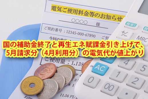 国の補助金終了と再生エネ賦課金引き上げで、5月請求分(4月利用分)の電気代が値上がり